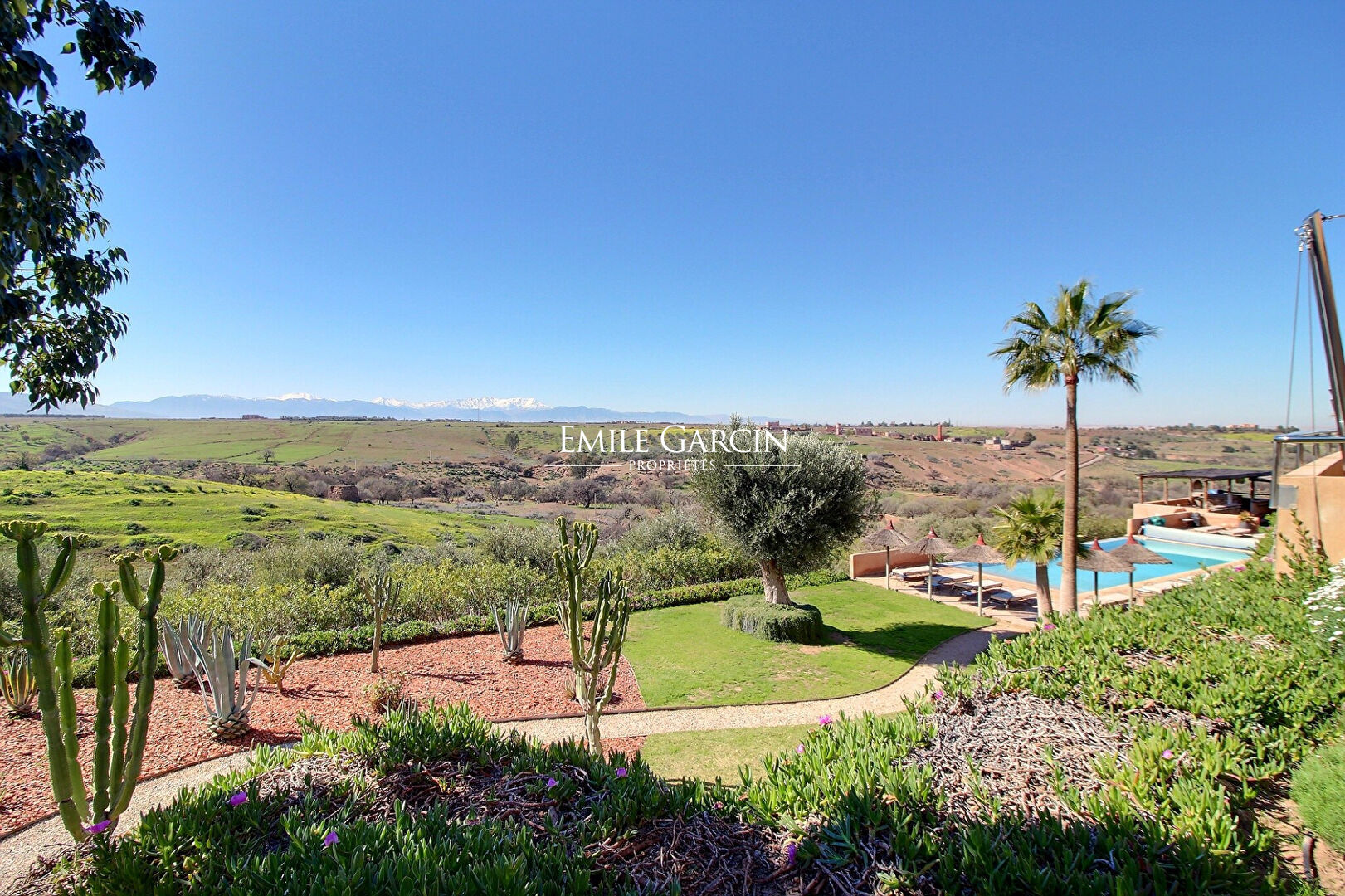 Nestling in the heart of hectare of perfectly maintained landscaped grounds just 30 minutes from the centre of Marrakech, this magnificent house presents 500 sq.m of living area with spectacular views of the Atlas Mountains. It features a spacious reception room centred around a fireplace, a fully equipped kitchen and seven bedrooms, each with its own bathroom. Outside you will find large furnished terraces, a separate pavilion, a hammam, a heated swimming pool (17 x 6m), a pool house and a caretaker's cottage. Equipped with solar panels and an automated watering system, this residence presents the perfect blend of character and authenticity while being fully immersed in an exceptional natural setting.